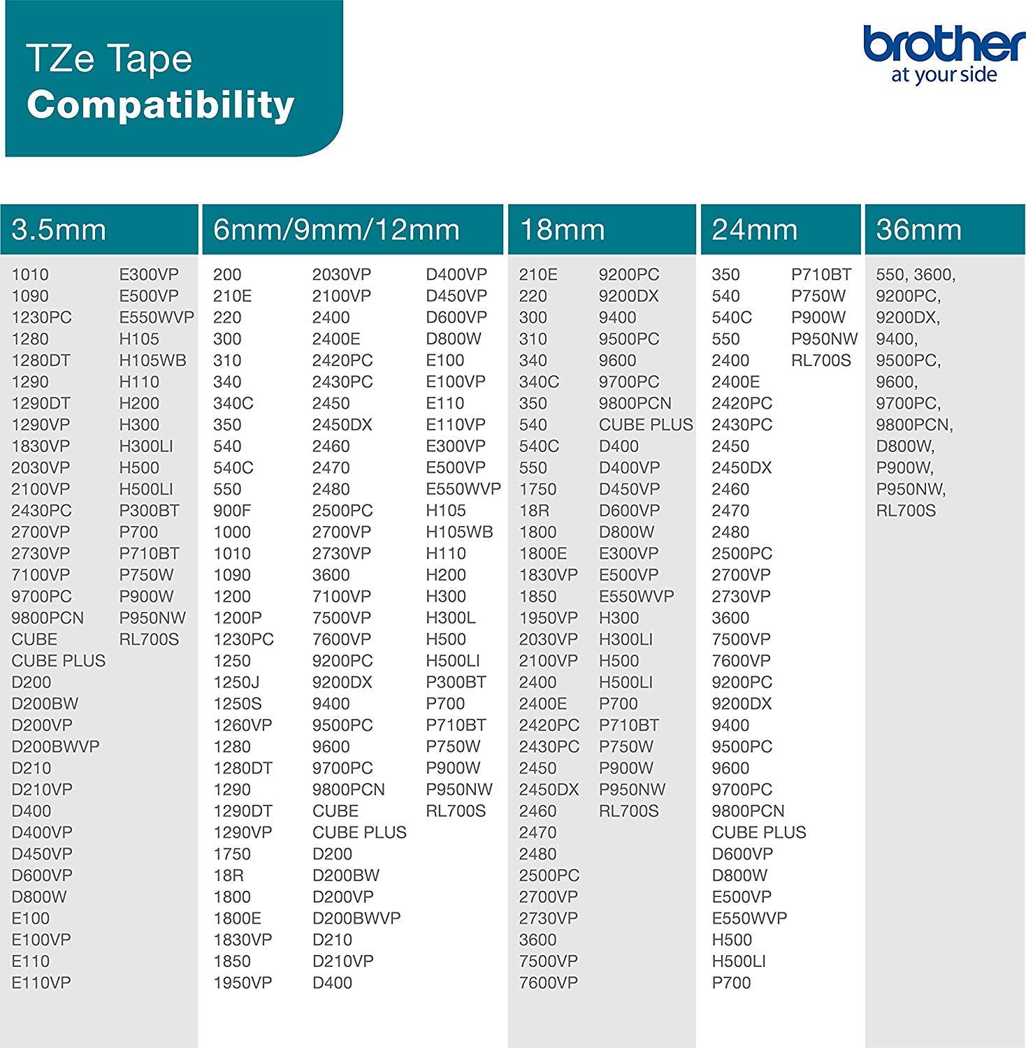 - Suitable for the following brother devices: p-touch gl,, h 105, pt, pt, 1005, pt, 1010, 1080, 1090, 1100, 1280, 1290, 18, 1830, 2030, 2430, 2730, 3600, 7100, 9700, 9800, d200, d210, d400, d450, d600