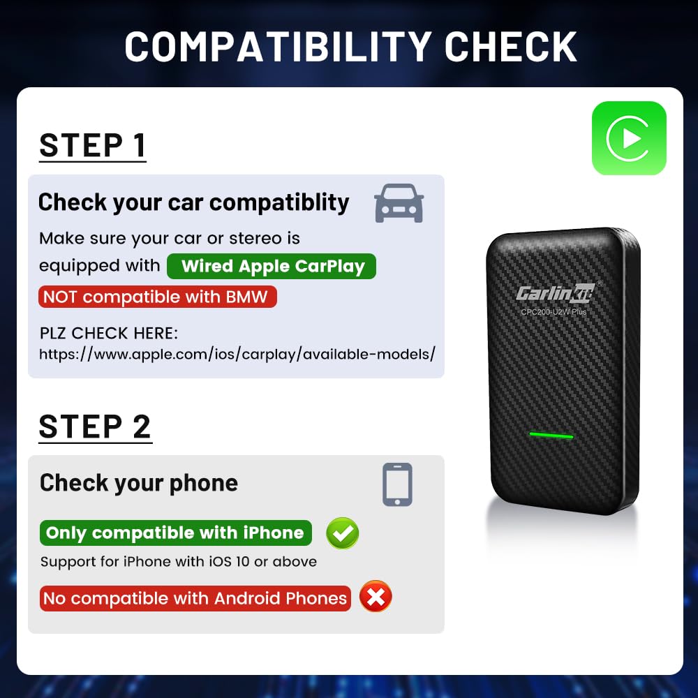 - 4- Compatible Device: Your car must have factory wired CarPlay installed. The Carlinkit 3.0 wireless adapter can run on all i-Phones from 5 (running iOS 7.1) to 14 Pro MAX(running ios 16). (How long does it take for the Carlinkit device to connect? It depends on your phone and car, but it usually takes 7-14 seconds.)