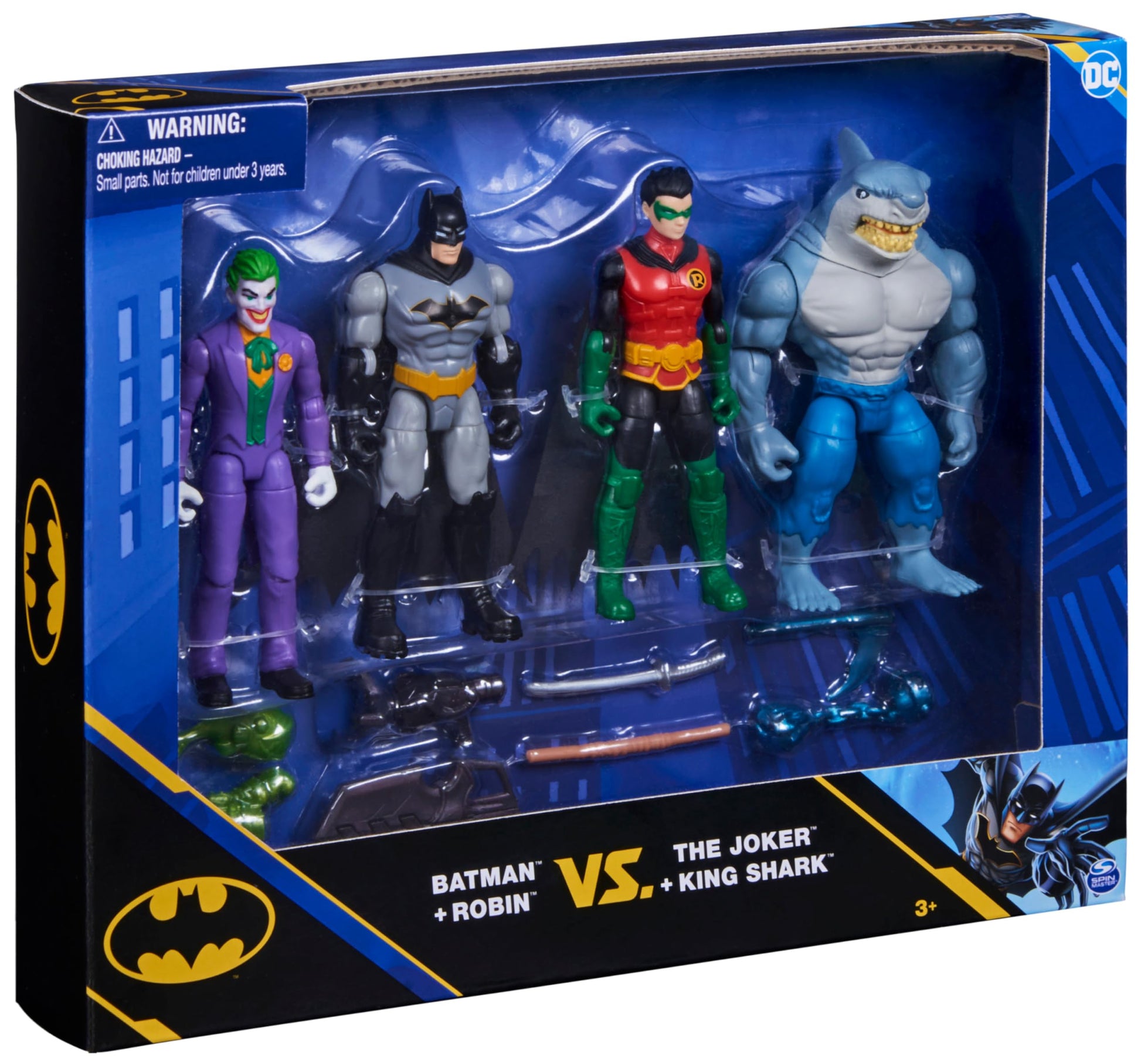 DC Comics, Batman and Robin vs. The Joker and King Shark, 4-inch Action Figures, Kids Toys for Boys and Girls Ages 3 and Up