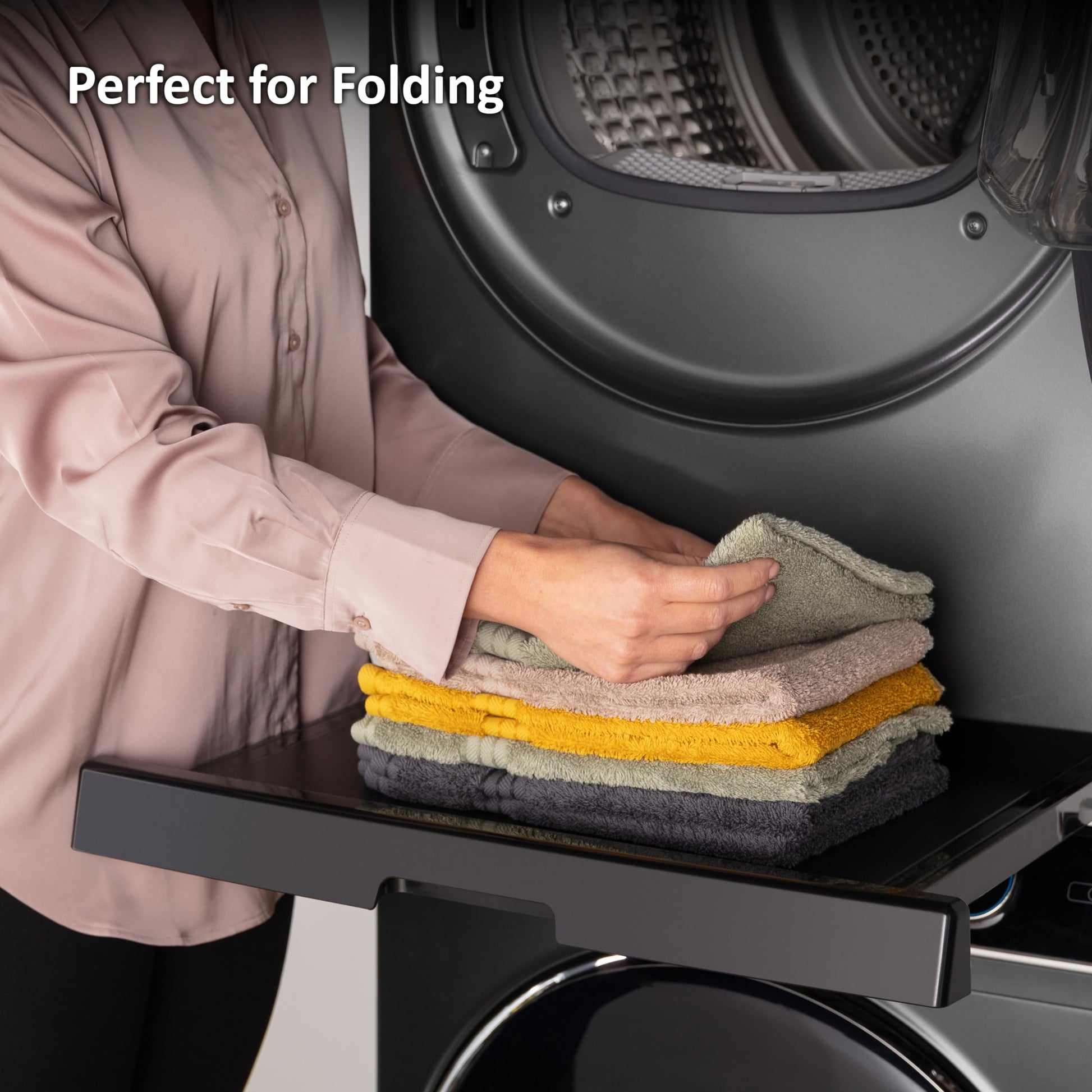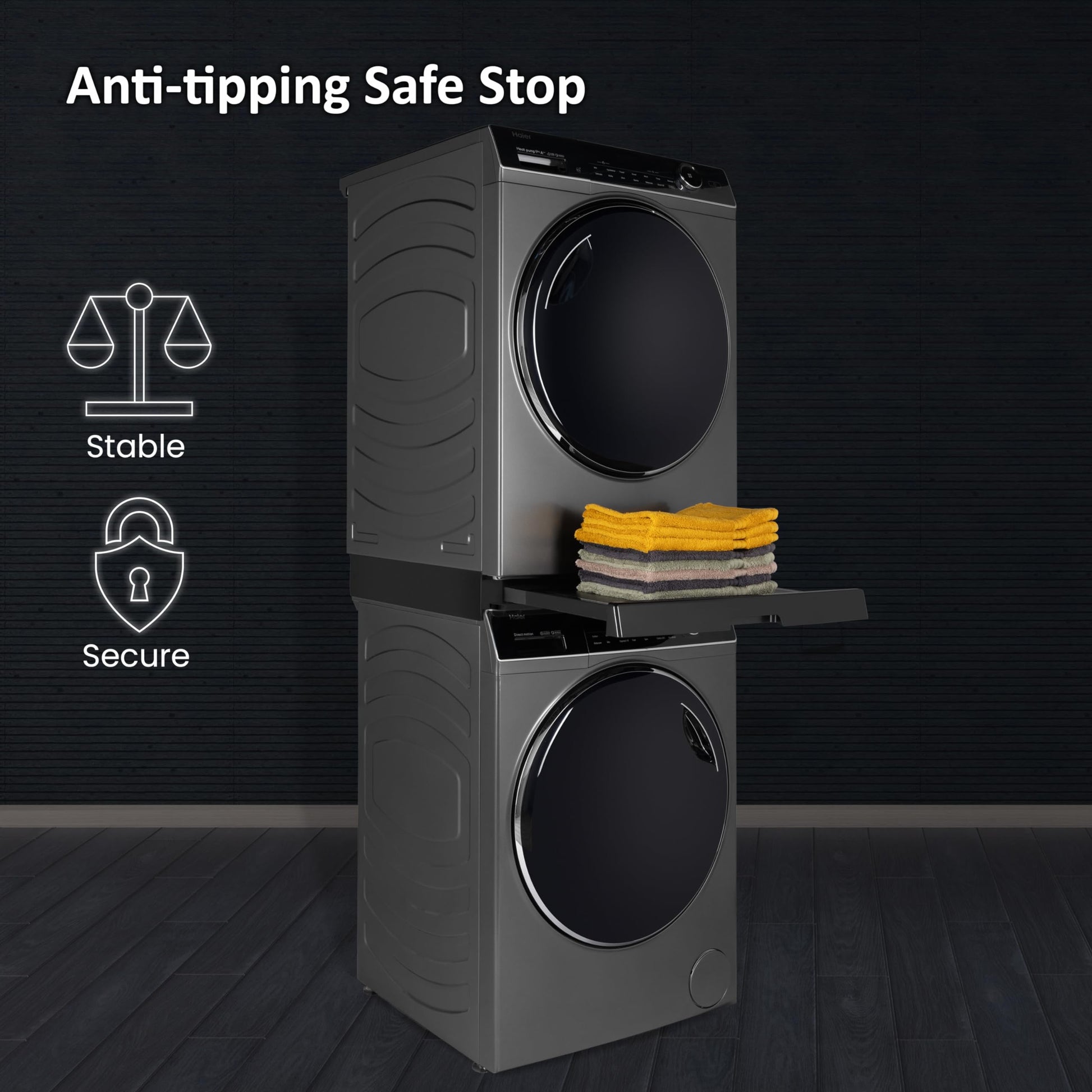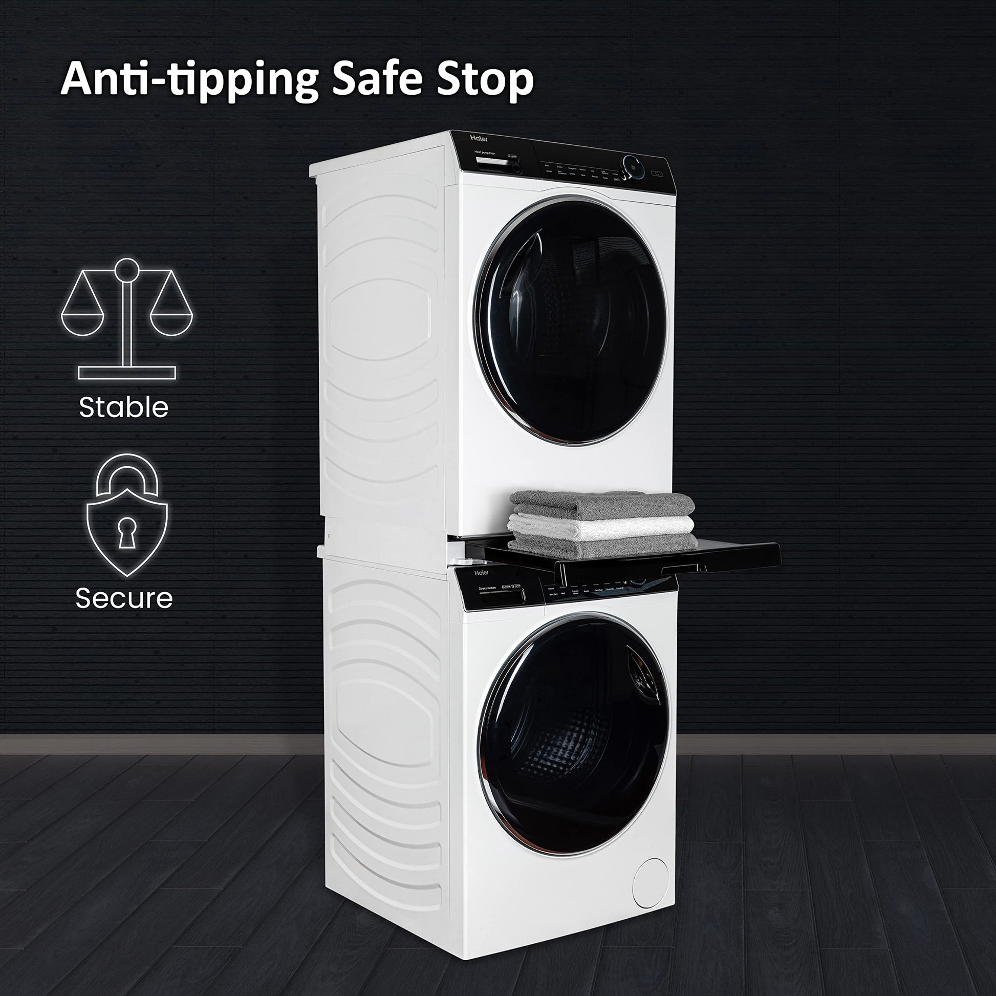 - PRACTICAL SLIDING SHELF: Haier stacking kit includes a 36 cm deep pull-out black shelf, equipped with an anti-tipping system that supports up to 12 kg of weight, which enable to easly load and unload your washer and dryer, as well as fold dried garments