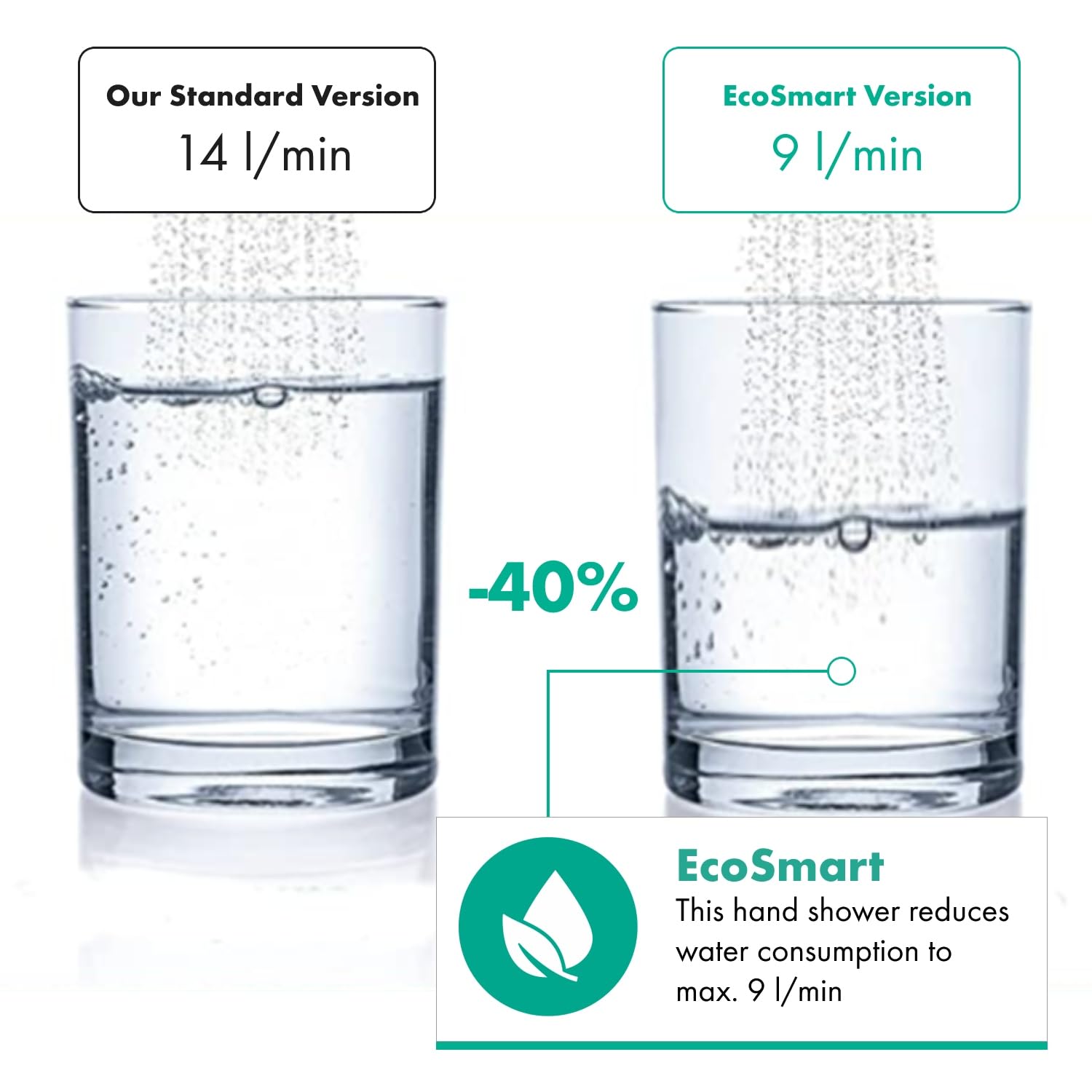 - Saves money and the environment: This shower head consumes max. 9 L/min. (EcoSmart)