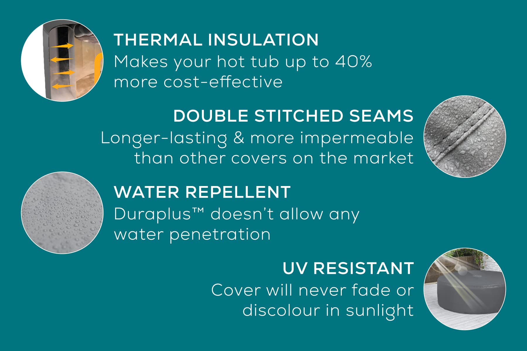 - WATER REPELLENT AND UV RESISTANT: The Lay-Z-Spa thermal hot tub covers are made from ultra-strong 3-ply UV resistant and completely water repellent Duraplus material, the same as our hot tubs, and have double-stitched seams making them strong and impermeable