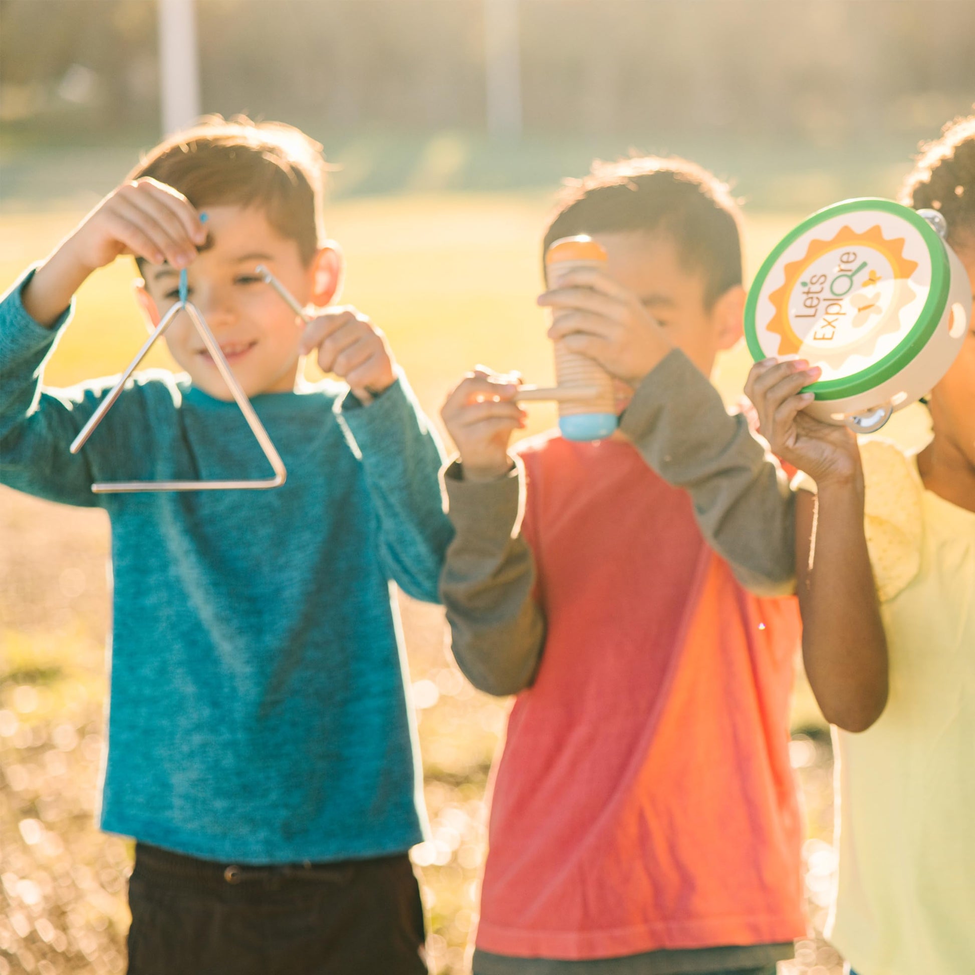 - Inklusive Guiro aus Holz und Metall, Schaber, Kastagnetten, Kazoo, Dreieck und Schlägel, Tamburin