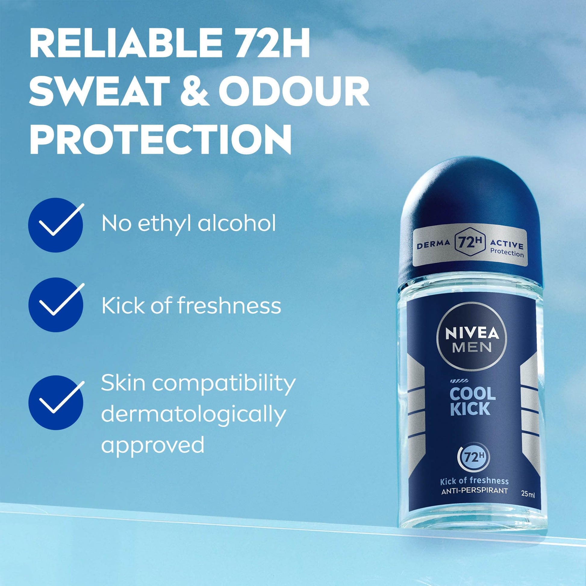 - DERMA 72H ACTIVE PROTECTION: This anti-perspirant roll-on prevents sweat and odour from forming for up to 72 hours of continuous protection, keeping you feeling fresher for longer