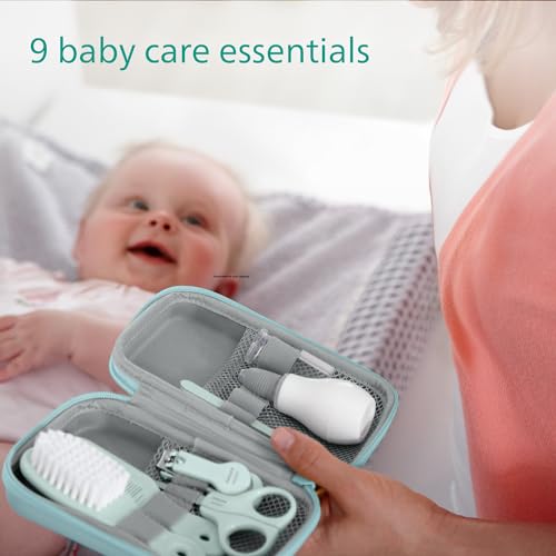 - 9 baby care essentials: a nail clipper, rounded-tip scissors and three emery boards, a rounded-tip comb, a soft hairbrush, a nasal aspirator and a finger toothbrush, everything a new parent needs