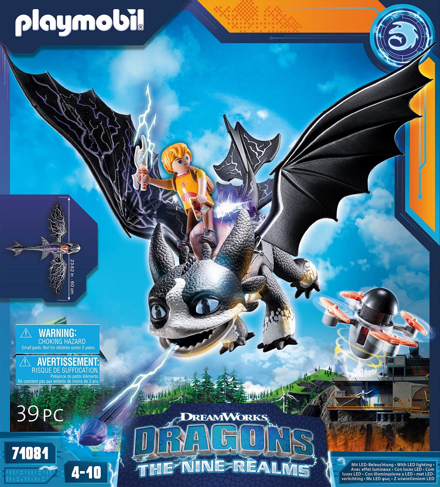 - Contents: 1x Playmobil DreamWorks Dragons: The Nine Realms - Thunder & Tom, 39-piece playset with instructions: 1 dragon, 1 drone, 1 figure, 36 accessories (requires 1x AA battery, not included), Material: plastic, LxWxH dragon: ~14 x 58 x 9 cm, Weight: 354 g, 71081